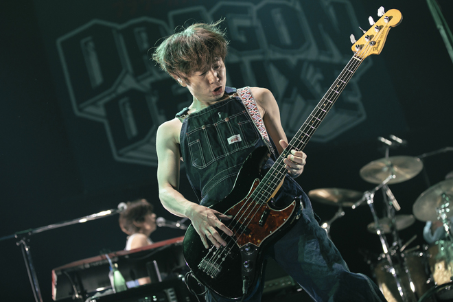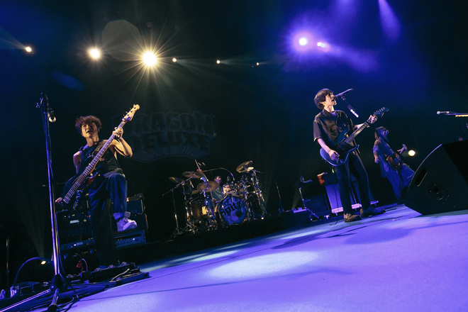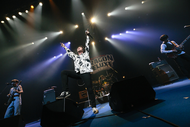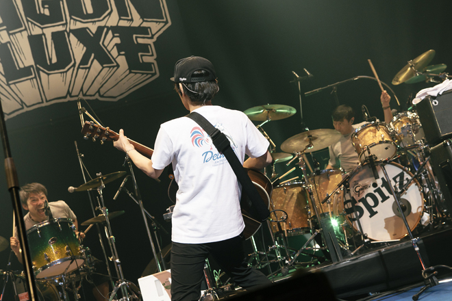 開演時間になるとまずはフラワーカンパニーズのメンバーがステージに登場し「センチュリーホールへようこそ!」とこのイベント恒例の挨拶でスタート。お客さんと一緒にタイトルコールを行い、スピッツを呼び込む。大歓声のなか迎えられたスピッツの4人は「ハイファイ・ローファイ」からスタート。繊細なようで存在感ある草野のボーカルが、一気にホールへ広がっていく。「フラワーカンパニーズ、30周年おめでとうございます。今日は田村が気合を入れた衣装で来ていますので」と草野が紹介するとおり、ベースの田村の衣装は、あきらかにグレートマエカワを意識した“裸に”オーバーオール。その後もフラワーカンパニーズのカバー「ビューティフルドリーマー」を披露するなど、<DRAGON DELUXE>特別バージョンのアクトが続く。「この前『前前前世』をカバーしたんだけど、その後にフラカンの曲をやると、意外とフラカンってスピッツに近いなと思うよね(笑)」と草野。終盤は連続テレビ小説『なつぞら』でおなじみ「優しいあの子」から、ライブでは欠かせない定番曲「トンガリ’95」「8823」、最後は説明不要の代表曲「涙がキラリ☆」でライブを締めくくった。