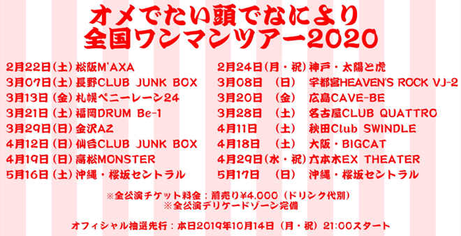 オメでたい頭でなによりが、2020年2月から5月にかけてワンマンツアー<オメでたい頭でなにより 全国ワンマンツアー2020>を開催する。