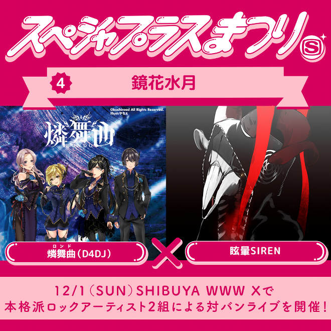 同イベントではShibuya WWWおよびWWW Xにて4公演が開催され、2組ずつ登場する出演者はそれぞれが初対バンとなる。WWW Xにて開催される最終公演は<スペシャプラスまつり-鏡花水月->と題され、燐舞曲(D4DJ)、眩暈SIRENが出演する。イベントの最新情報は<スペシャプラスまつり>特設サイトでチェックしてほしい。