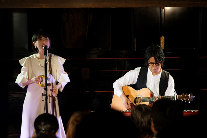 当日は「雨のち晴れのちスマイリー」からライブはスタート。「幼い時から知っているこの三渓園は私にとって特別な場所で、まさかここで演奏ができるとは思ってもいませんでした。今日はライトアップされている美しい景色と音楽をお楽しみ下さい」と挨拶すると会場から拍手が起こった。