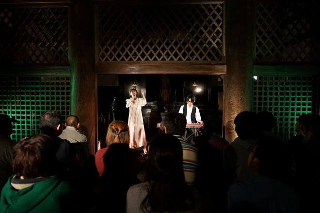 同イベントは幻想的にライトアップされた園内と重要文化財「旧燈明寺本堂」で開催されるスペシャルライブ。和と音楽のコラボレーションを楽しむイベントで、9月20日~11月1日までの19日間開催されている。