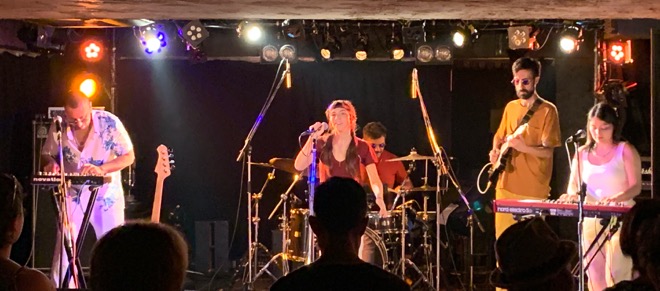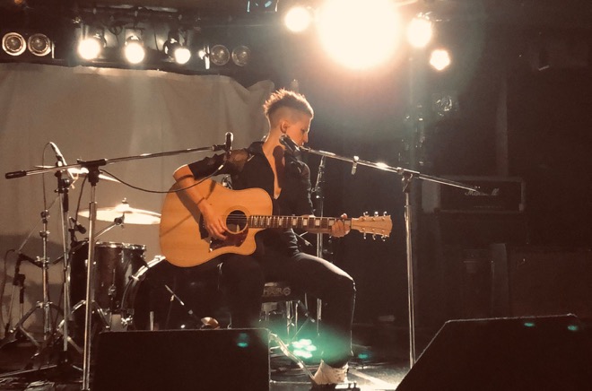 3番手はAlone and meという名義の女性ソロ・ボーカル。といっても単なる弾き語りとかではなくルーパーを使った一人バンド・パフォーマンス。色んな奏法のギターや声をその場でどんどん重ねていく様を見せつつのライヴだ。この手のやり方って反復する音の積み重ねで終わってしまう人が多いけど、彼女の場合はちゃんと曲が展開していくより高度な方向性。しかもズッと座っていながらも手足を大きく動かしての身振り手振りも伴っていた。ここ数年で100回以上の公演をやっているというのがうなづけるスキルの持ち主だった。