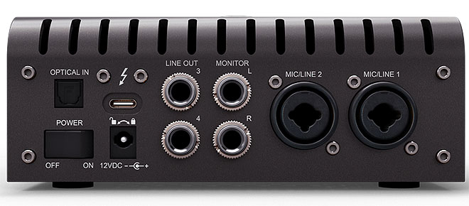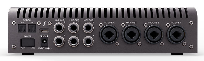▲Apollo x4はフロントに各2系統のHi-Z入力とヘッドホン出力、リアにUnisonプリアンプ4基、アナログ出力×6、ADAT入出力(S/P DIFオプティカル兼用)を搭載、合わせて最大12イン/18アウトを実現。
