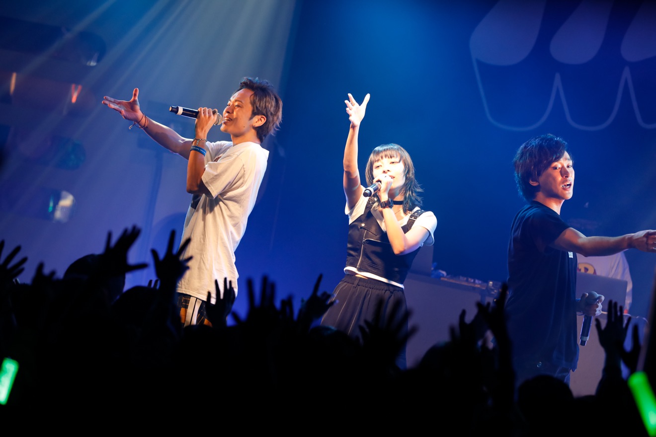財部のステージを受け、「MCをこんなに間近で聞くことは初めてで、歌ってる途中で泣きそうになっちゃった」と明かすJENNI。としみつも「緊張したよね、こっちも。らべさん、こんな真剣にMCしてるんだなと思って」と感極まった様子だ。そして、財部がコーラスに回り、次はJENNIがメインポジションへ。「Gx3」でジャンプをしてほしいとお客さんにレクチャーするJENNIの後ろで、財部ととしみつがドスドスとジャンプしたりと、スキあらば悪ノリする2人が楽しそう。
