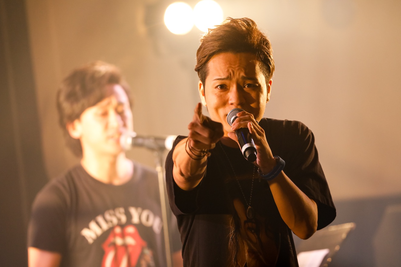 バラード「Not me」を歌い上げたあとは、2011年3月に会社を辞めて福岡から上京した頃のエピソードを話す財部。当時、初めてかわいがってもらった先輩がいて、その先輩が主催したライヴを観に来たのがここ渋谷duo MUSIC EXCHANGEで、「あの頃は俺もいつかこのステージに立って、歌を聴かせられたらいいな」と思っていたのだという。そんな流れで「歌うことによってみなさんの背中を押せたら」と披露した応援歌「胡蝶蘭」は、バンドサウンドに乗って気持ちよく場内に響きわたった。