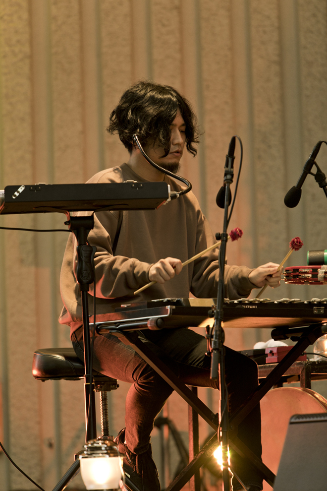 トークの後に始まったのは「BEN」。宮原が足でリズムを刻みながら、再び手にはギターを持ち、柳下とセッションをしながら、そこに芹澤が弾くグロッケンの音色が加わり絶妙なバランスを生み出している。そして、スペアザのメジャーデビュー曲をセルフカバーした「IDOL」では柳下のアコギのイントロが流れ始めると、観客から大歓喜が沸き起こった。芹澤がオーシャンドラムを頭の上で転がし、波の音を再現して始まる「LINE」、そして「Birdie」と会場は盛り上がりを見せる。その勢いのまま「Wait for the Sun」を演奏し、「みなさん、改めまして5年間支えてくださってありがとうございます。(上野恩賜公園野外ステージは)場所もいいね。ここで来年もやりたいですね。来年もここで会えたら会いましょう!ありがとうございました」と観客に感謝の気持ちを述べた後、SOA名義では未音源化のスペアザ曲「Parabola」を披露。ギターとピアニカのみのシンプルなメロディながら、又吉のクラベスと宮原のパンデイロのリズム隊が加わることで、ひとつひとつの音が繊細に交差するアンサンブルに会場全体が心地いい雰囲気に包まれ、本編は終了した。