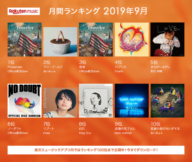 今月はOfficial髭男dismの「Pretender」が、 8月の月間再生ランキングに続き2カ月連続で1位を獲得。 Official髭男dismのメジャー1stアルバム『Traveler』に収録された「宿命」「ノーダウト」も先月からのトップ10圏内を維持している。 またRakuten Musicでは、 本アルバムの配信を記念して、 アプリ内で『Traveler』をマイページ登録した方の中から抽選でメンバーのサイン入りポスターをプレゼントするキャンペーンを実施中だ。