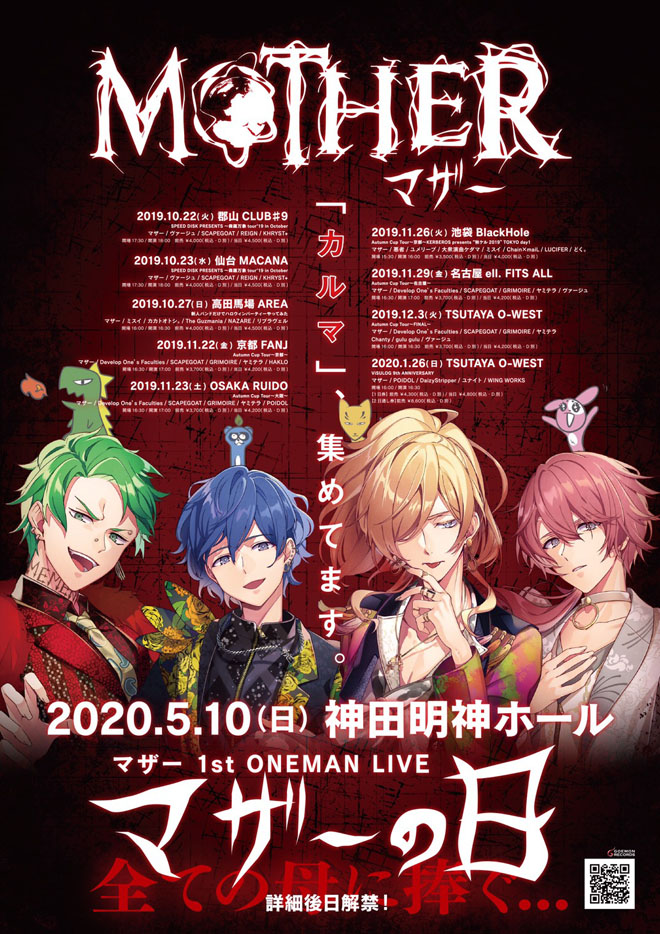 “動物が人々からカルマを集め人間に変化する”というコンセプトのもと活動するV系バンド「マザー」。来年2020年5月10日・母の日に神田明神ホールにて初のワンマン公演を開催することがアナウンスされているが、先日開催されたイベント<P-kon>出演時には、A狐(Vo)の実母がステージに登場して会場を沸かせた。その模様はYou Tubeのマザーオフィシャルチャンネルにて見ることが出来る。