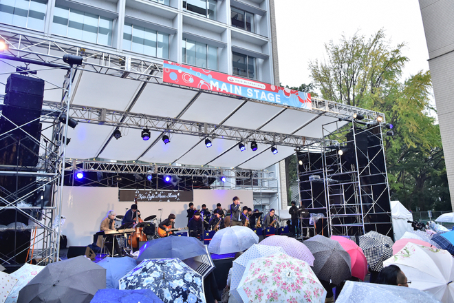 今回の共演は、クイーンやスティーヴィー・ワンダーの楽曲をビッグバンド・アレンジでカバーした佐藤の最新作『Don’t Stop Me Now 〜Cornerstones EP〜』を聴いた同バンドからのオファーで急きょ実現したのだという。中庭に設置された野外メインステージに登場した佐藤は、新作のタイトル曲でもあるクイーンの「ドント・ストップ・ミー・ナウ」をバンドと共に披露。雨の中集まった観客たちからは歓声が沸き起こった。