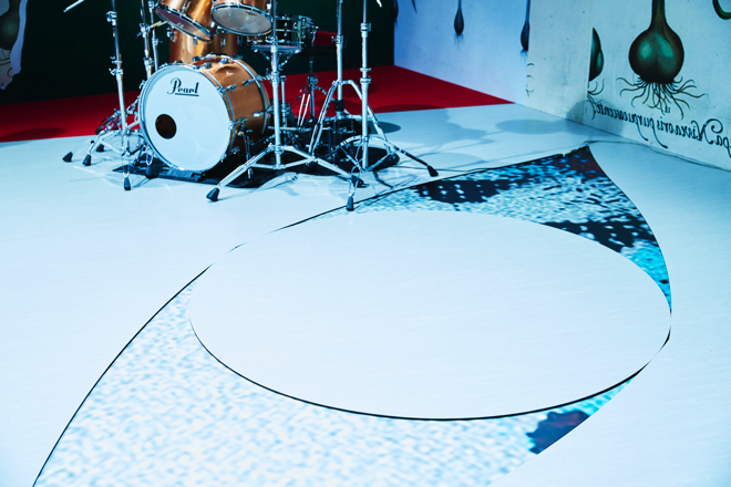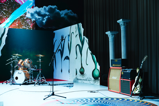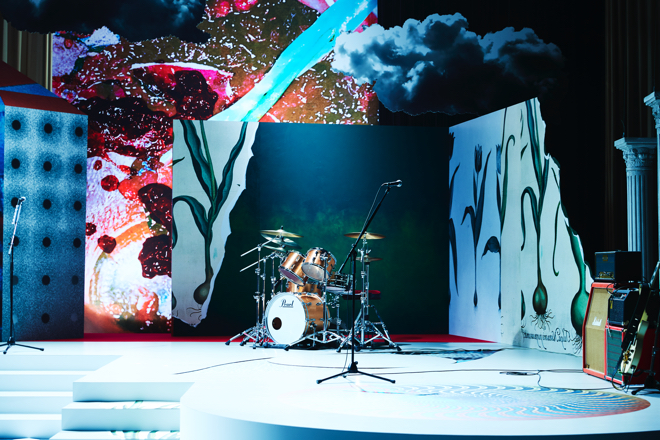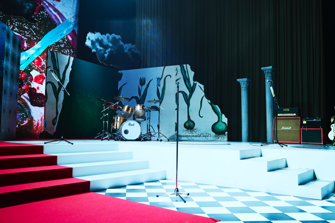 “新しい音楽を作り続けている場所”=レコーディングスタジオに見立てたセットでのパフォーマンスに続き、舞台は“スタジオ”で作った音楽を届ける“ステージ”の世界へ。こちらのセットには「JAM」や「パール」「バラ色の日々」など、彼らがこれまでリリースしてきた代表曲の歌詞やモチーフが散りばめられている。背面のアートは「JAM」の《この世界に真っ赤なジャムを塗って》という歌詞から、監督自ら本物のジャムを塗ってデザイン画を描き制作されたそうだ。