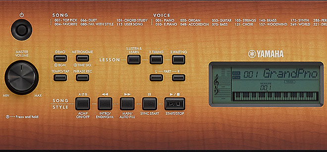 注目は世界中のリズムスタイル130種を揃えた伴奏機能。左手でコードを押さえ、右手でメロディを演奏すれば、ゴージャスなバッキング付きの演奏が可能。鍵盤の奥にあるボタンでイントロやメイン/フィルインを指定すれば曲の流れに合わせて伴奏も変化。エンディングを押せばいい感じのフレーズで曲を締めてくれる。ちなみにコード指定は、指1本でメジャーコード(ソを押せばG)、1つ左の音を加えればマイナーコード(ソとファ#を押せばGm)と、簡易的な押さえ方も用意。初めてでも短時間で伴奏付きの演奏が楽しめるようになる。内蔵曲を使ったレッスン機能とあわせてビギナーにうれしい機能が揃っているというわけだ。