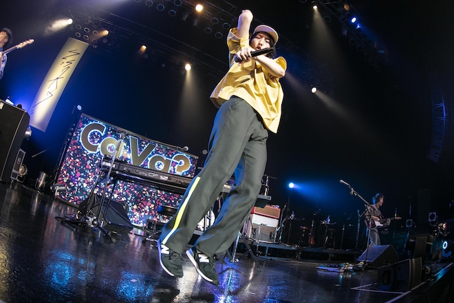 そんな新曲の最中、大きく描かれた「CA VA」のロゴの電飾がピカピカ点滅し、Vの文字だけが光ったりも。V……もちろんVickeblankaのVでもある。続いて「Smash(Right This Way)」と「キロン」もDJセットで歌われ、その2曲はキラキラしたサウンドと相まってビッケのファルセットが天まで届くようだった。また「キロン」の途中では、ステージ前方にバンドメンバーとヴァイオリンでゲスト参加の岡部磨知と天野恵(ふたりは6月14日に新木場Studio Coastで行なわれたビッケの<Voom Voom Room>公演にも参加した)が横並びになり、タオルを回して盛りあげた。