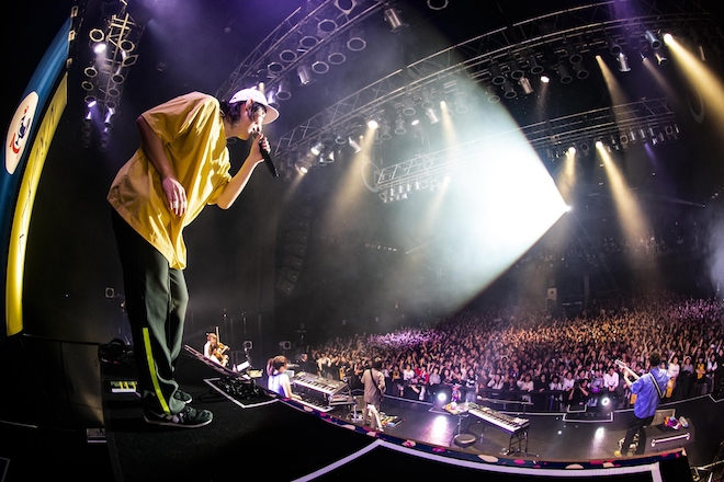 「EDMとかギターロックとかいろいろやらせてもらったけど、僕が一番初めに作ったのはバラードでした。バラードが僕の根底にあると思います。ここで2曲バラードを聴いてください」。そう言うと、自身の経験と重なり出来た大事な曲でもあるという「Lucky Ending」をピアノを弾きながら じっくり歌い、続けて彼の新しい代表曲となったドラマ挿入歌「まっしろ」を歌唱。これらのパートからヴァインオリンの岡部磨知と天野恵も演奏に加わり、「まっしろ」はふたりの弦の音色がより美しく響き渡りドラマチックに曲のよさを際立たせていた。