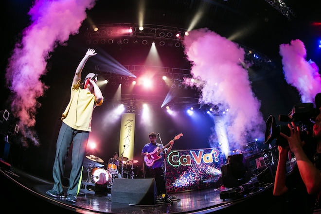 バンドメンバーの若山雅弘(Dr)、大澤DD拓海(B)、井手上誠(G)、にしのえみ(Key)がステージに出てきて位置につき、最後に主役のビッケブランカが登場する。そしてビッケがピアノを弾きながら、ツアータイトルにもなった最新シングル「Ca Va?」の始まりのフランス語部分をシャンソン歌手のように感情込めて歌い出すと、登場時よりも大きな歓声が。いつにも増してたっぷり間をとりながら歌い、気持ちよすぎてか自分で思わず笑ってしまうビッケ。“カカカッカッカッ・カモン! サバー”の声と同時にバンドが躍動感ある演奏を開始し、ビッケはピアノから離れてステージ中央へ、そしてステージ端へと歩きながら歌って、満面の笑みで観客に手を振ったりもしていた。