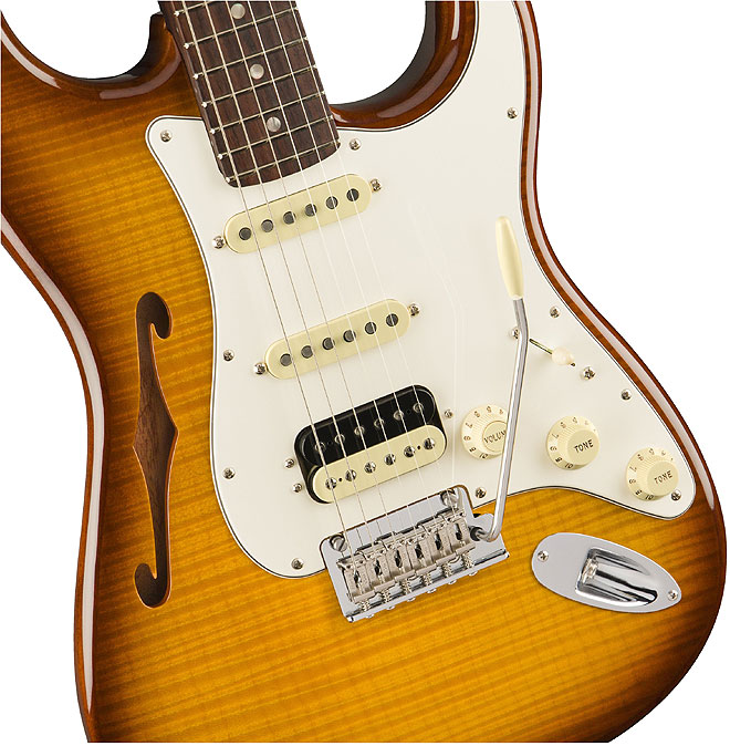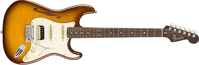 フェンダー、木目の美しいセミホローボディのフレイムメイプルトップStratocaster HSS登場