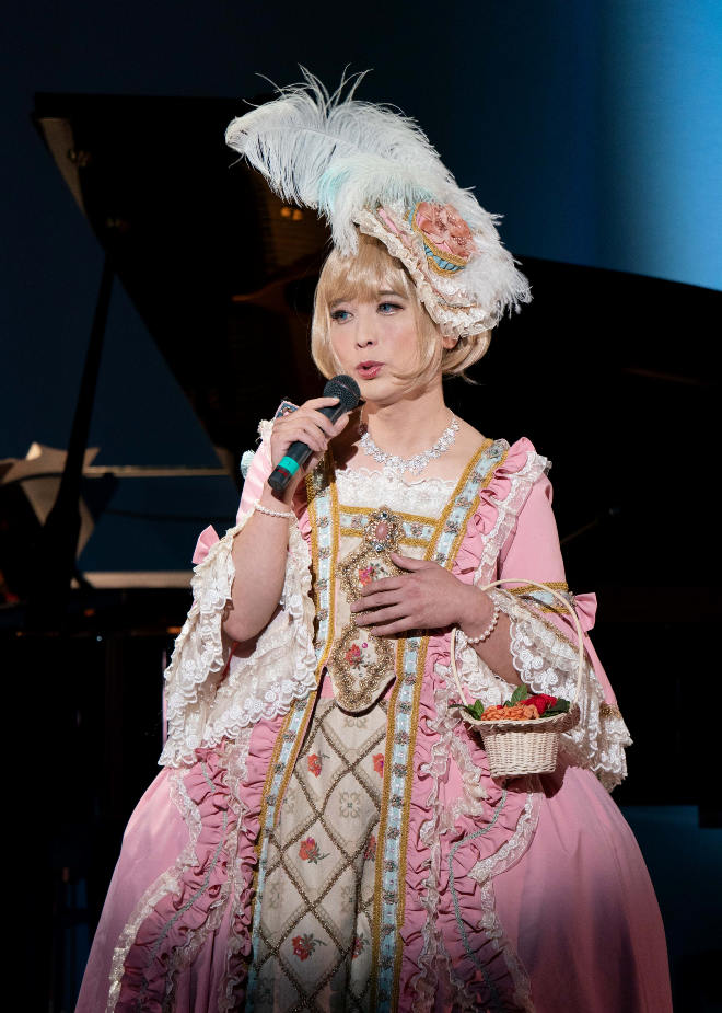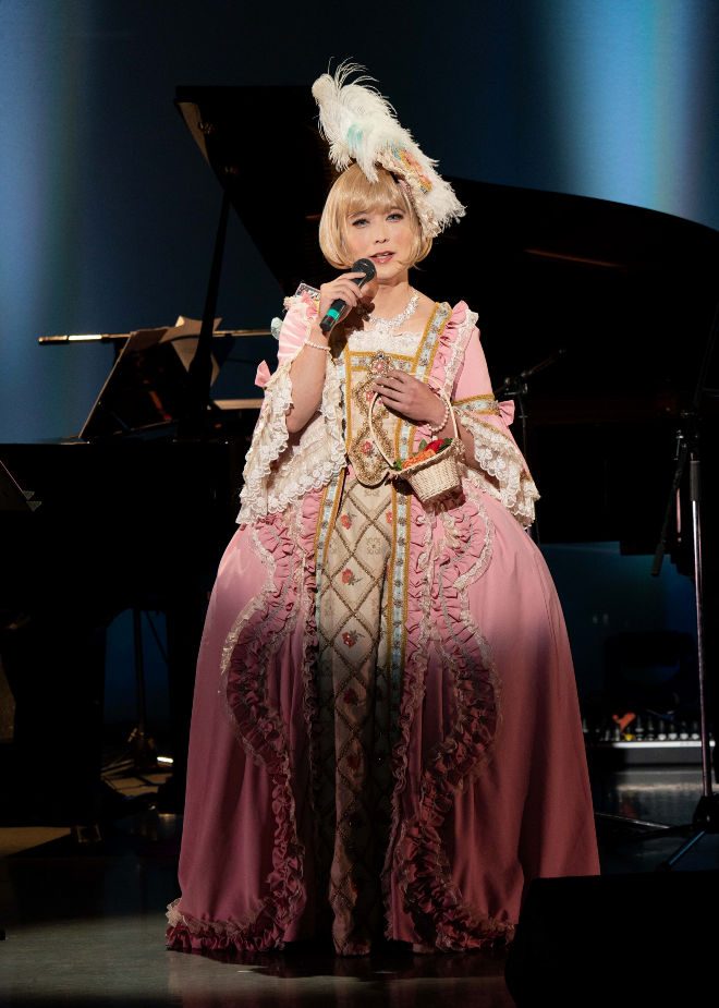 そして、「今日はカラーコンタクトも付けて青い瞳になり、衣装はフランス貴族をイメージしています。シャンソンも好きでして、マヒナスターズに入る前はシャンソンを習っていて、戸川昌子先生のお店“青い部屋”には毎週通っていました。1部は、シャンソン的な装いで歌を聴いていただきたい」とあいさつし、「時計」「シェルブールの雨傘」「誰もいない海」などを披露した。