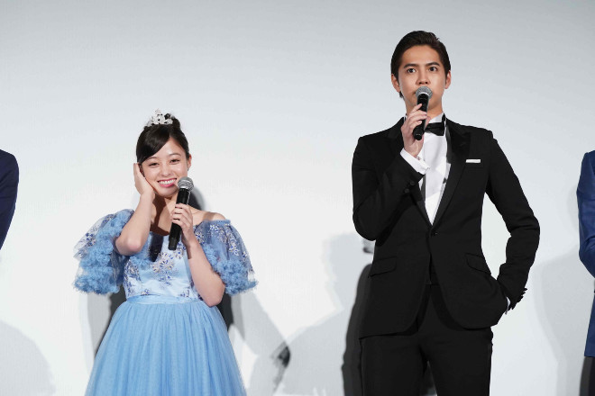 場所を移して行われた舞台挨拶でも、<リアル・シンデレライベント>登壇者たちが勢揃いし、それぞれの役についてトーク。“国民的スーパースターと女子高生の“ヒミツの恋”を描いた作品にちなんで、共演者の“ヒミツ”を問われると、片寄は、橋本が撮影中、11時近くになると「お腹空きそうだな」と空腹を予言する発言をしていたというエピソードを披露。「あんまり天然的な部分はない橋本さんなんですけど、唯一、僕が撮影の時に思ったのは『お腹空いてきそうだな』と予言する、それはなんだろうな……と思いました」と説明すると、橋本は「自覚なかったですよ、だってお腹空きそうなんですもん」と笑顔で答えた。