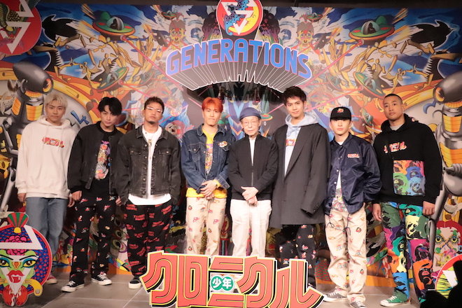 <少年クロニクル>の世界観を描いたこのポップアップストアでは、同ツアーのツアーロゴやグッズなどアートワーク、ストアの店舗内装を担当したグラフィックデザイナー・田名網敬一氏とGENERATIONSの限定コラボアイテム16種類20アイテムが販売される。佐野玲於、関口メンディーの2人を中心に、メンバーもアイテムのディレクションを手がけている。オープンに先駆け、本日11月19日にはマスコミ向け囲み取材が行われ、田名網敬一氏とGENERATIONSのメンバーが登壇した。
