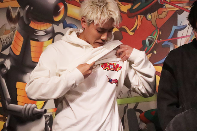 そんなアイテムの中で特におすすめのアイテムとして、片寄涼太と佐野玲於はパジャマ、数原龍友はパーカー、小森隼は本日インナーで着用したTシャツ、中務裕太はチノパン、関口メンディーはバッグとパンツを挙げた。白濱亜嵐はスケートボードがかっこいいと思ったそう。これらのアイテムはポップアップストアとオンラインショップのみで購入できる。