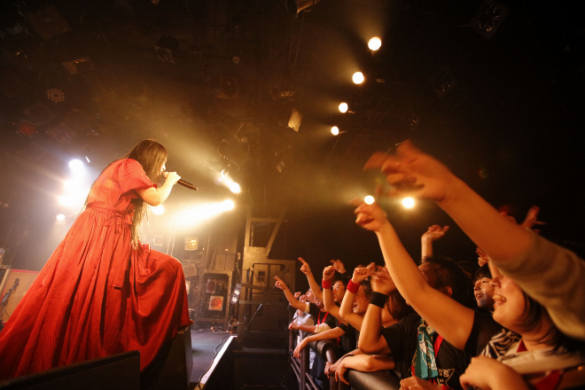 去る9月27日に渋谷クラブクアトロにて開催されたライブ終了後に、観客を交えて新曲「ジュビリー」のMV撮影を行なった天野月。