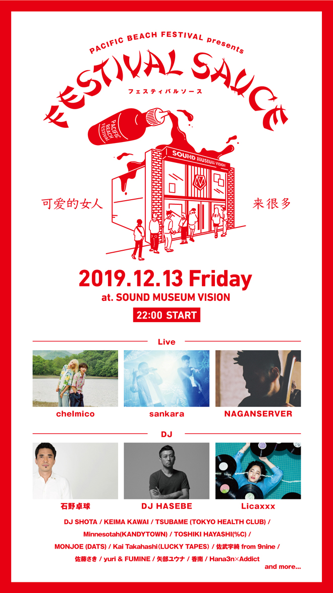 12月13日(金)にSOUND MUSEUM VISIONにて開催されるイベント<PACIFIC BEACH FESTIVAL presents FESTIVAL SAUCE>より、出演者の第二弾発表が行われた。