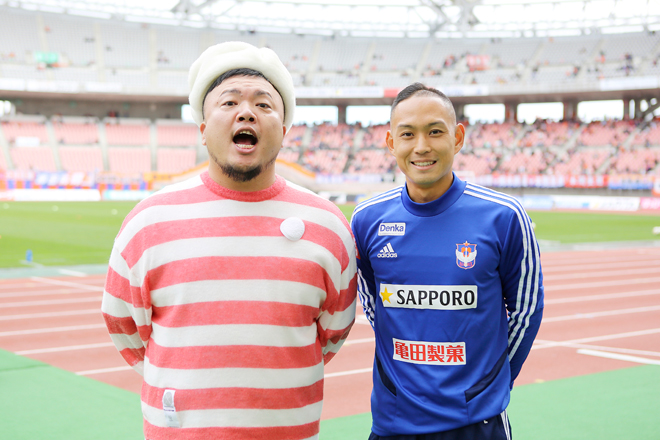 ▲左からHIPPY、早川史哉選手(アルビレックス新潟)