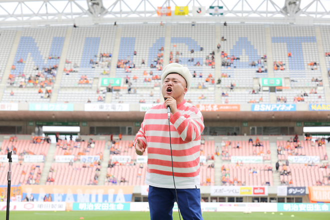 広島出身のシンガーソングライター・HIPPYが11月9日、新潟・デンカビッグスワンスタジアムで開催された明治安田生命J2リーグ アルビレックス新潟のホームゲームに登場。エールソング「君に捧げる応援歌」を熱唱した。