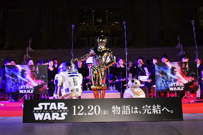 また、指揮を担当した東郷源氏は「(いつも演奏するのと)全く違いますね。スター・ウォーズはエピソード4から『スカイウォーカーの夜明け』までメインテーマが変わらない。スカイウォーカー家の物語は終わりだと言われていますが、狹川さんの言うように、 1000年、2000年と語り継がれる始まりじゃないかと思う」とコメント。会場には同シリーズの人気ドロイド・R2-D2とC-3PO、BB-8も駆けつけ、満月の夜の境内に名曲が響き渡る幻想的なイベントは幕を閉じた。