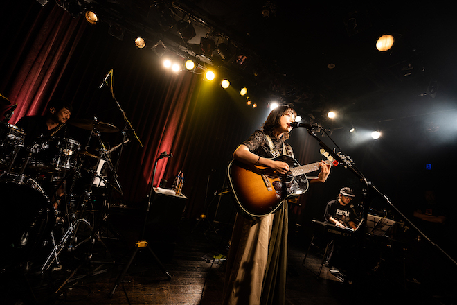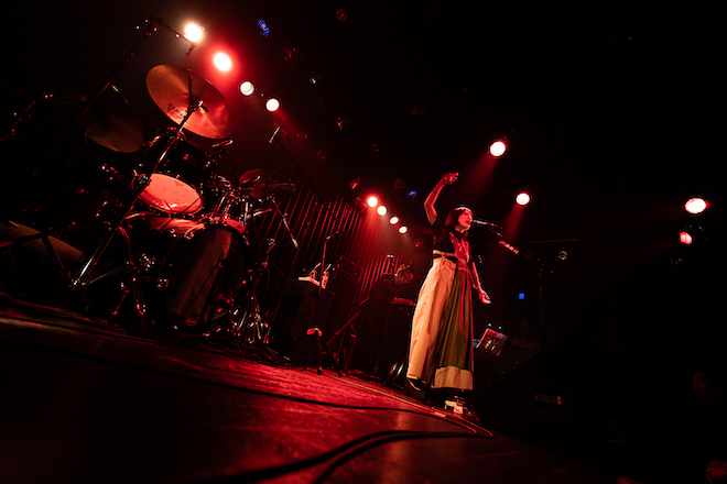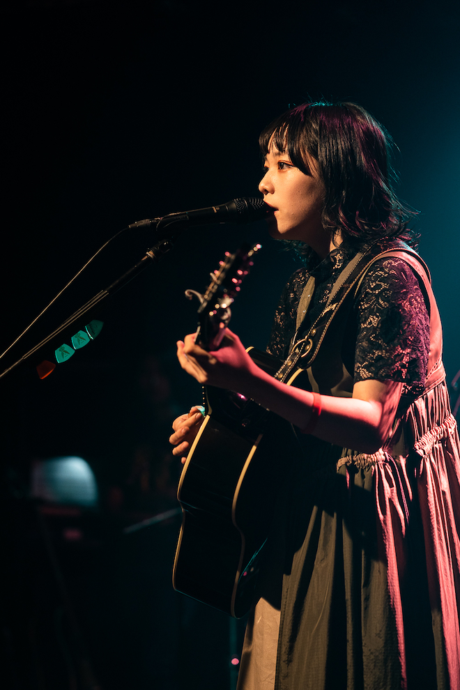 MCでは自らアンケートを取り、初見のオーディエンスも多く見受けられることが判明。場内のBGMも全て彼女自身が選んでいることなどを語り、「朝4時ぐらいまで動画を見て勉強してきました!」と同世代のシンガーソングライターである崎山蒼志の弾き語りカバーでも場を沸かせるなど、これまで見せてきた迫力や凄みとはまた異なり、等身大のアットホームなムードもまた心地よい。