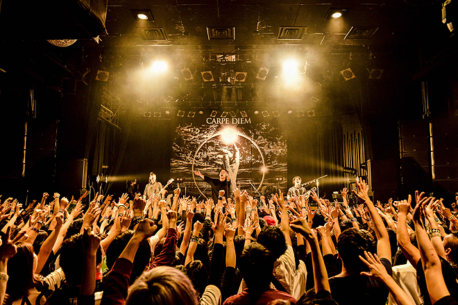 メンバーからは、「アルバムリリースから1か月。20周年を経て4年振りにフルアルバムを新鮮な気持ちで作って、ここから始まっていくツアー。このアルバムの曲たちをみんなに聴かせる日がやってくるのをワクワクしながら過ごしていました。死ぬ気でやるのは礼儀として当たり前で、生きる気持ちにさせる音楽をやらなきゃ意味がないなと思っています。この『カルペ・ディエム』は4人の力を集めた最高のアルバム。このツアーは今を掴む、生きるための音楽をやっていきます。生きるためのライブをやります」と熱いメッセージが届けられた。