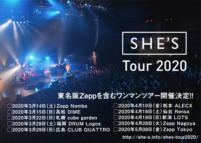 SHE’Sは、2020年3月から東名阪Zepp公演を含む全国ワンマンツアー<SHE’S Tour 2020>を開催することも発表となった。3月14日の地元大阪・Zepp Namba公演を皮切りに、5月8日の東京・Zepp Tokyoまで、全10ヵ所を巡るツアーとなる。チケットのオフィシャルファンクラブ「SHE“Zoo”」会員先行予約は11月22日(金)22:00より。
