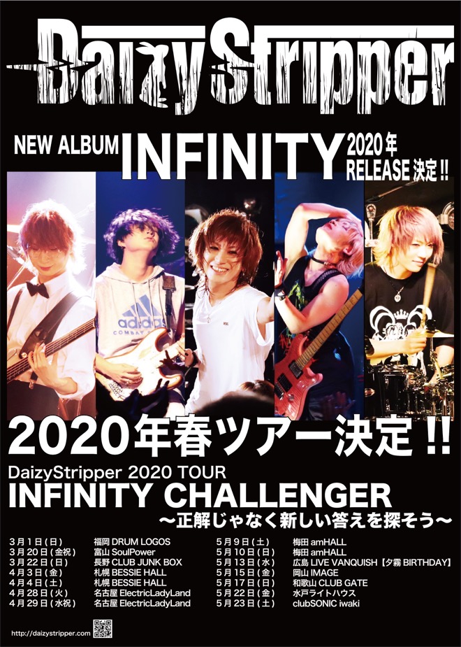 DaizyStripperが2020年、ニューアルバム『INFINITY』をリリースすることが発表となったことに加え、同年春より全国ツアー<DaizyStripper 2020 TOUR INFINITY CHALLENGER 〜正解じゃなく新しい答えを探そう〜>を開催することが決定した。