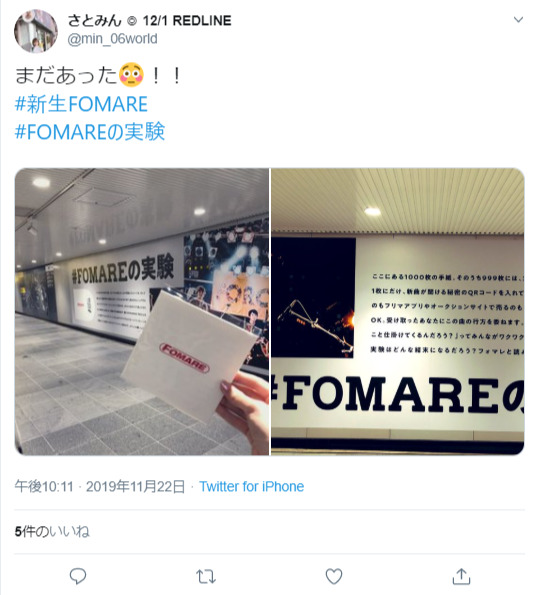 手紙を剥がした人々からは “FOMAREってバンドはきいたことあるけどこんなわくわくするようなことするバンドだなんて知らなかった”、 “自分が当たったらファンの方々ためにシェアします!”、“売るなんてもったない!”という声があがり、前代未聞の実験企画に対し、バンドを知っている人も知らないし人も楽しんで参加している様子だった。