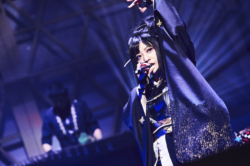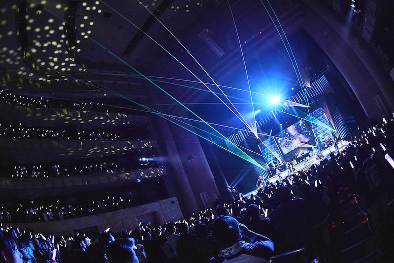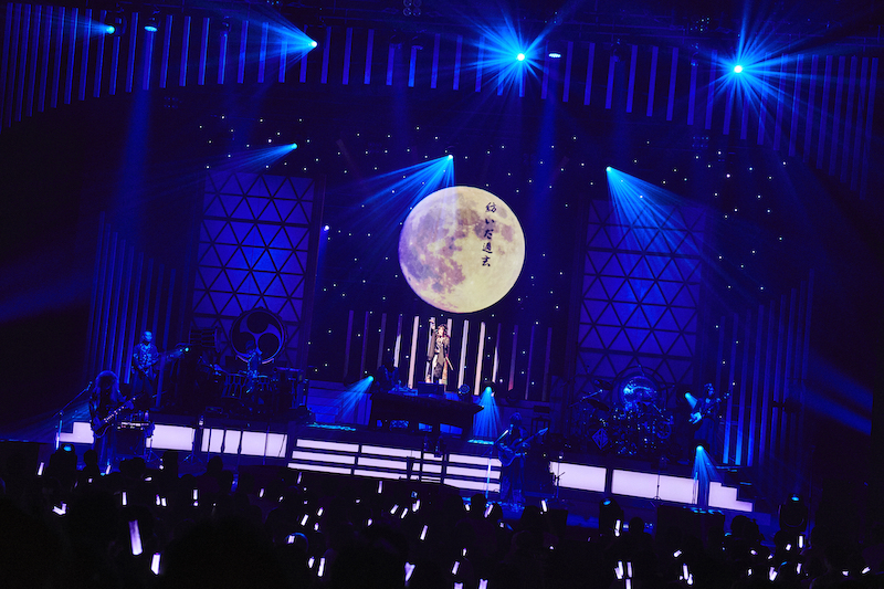 まず1曲目「雨のち感情論」から、演出の美しさに驚かされた。星の映し出されたスクリーン、青いレーザー照明、それにファンのかざすペンライトの光が相まって、まさに歌詞の“君と夢見た銀河”の様相だ。そこから「天樂」「吉原ラメント」と、ボカロ曲のカバーから始まった和楽器バンドらしい2曲が続く。「吉原ラメント」での遊郭にいるような艶っぽい演出も美しかったのだが、この2曲で感じたのはこれまでよりもぐっと8人の音が聴きやすくなったこと。