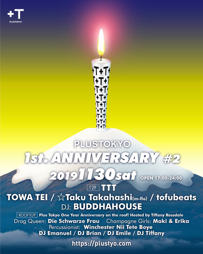 30日<#2>では3人の“T”が集結する<TTT>とタッグを組む。TOWA TEI、☆Taku Takahashi(m-flo)、tofubeatsの3人に加えてBUDDHAHOUSEがサポートする。またこの日のルーフトップはDJティファニーがホストを務める<PLUSTOKYO One Year Anniversary on the roof!>も同時開催。ドラァグクイーン、シャンパンガール、パーカッショニストなどが一堂に会し、12階以上に熱いルーフトップパーティになる予感……。