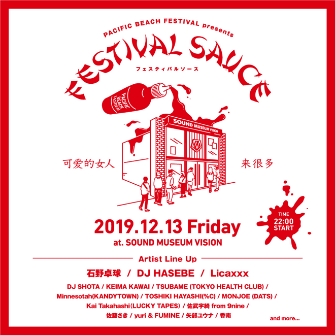2020年の開催に先立ち、この後12月13日(金)には東京・SOUND MUSEUM VISIONで<PACIFIC BEACH FESTIVAL presents FESTIVAL SAUCE>と題したイベントが行なわれる。同イベントには、石野卓球、DJ HASEBE、Licaxxx、chelmico、sankara、NAGAN SERVEらが出演。チケットは現在発売中となっている。