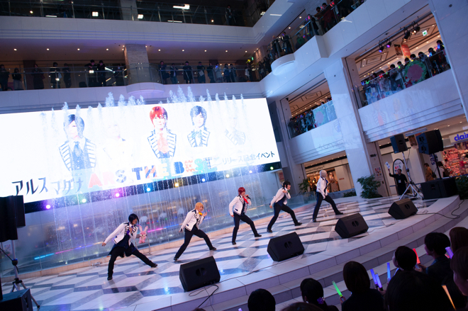 その発売記念として開催されたこのイベントには、地下1Fから3Fまで満員のオーディエンスが集結。大歓声を浴びながら登場したアルスマグナの5人は、メンバーカラーの扇子を華麗に振り回しながら1曲目「ミロク乃ハナ」から全力パフォーマンス。あらゆるエンターテインメントを追求する彼らの根底にあるダンスの凄み、観る者を一切飽きさせない振り付けでもって、アルスメイトはもちろん、偶然居合わせた池袋サンシャインシティの利用客までも煽情していく。そして、「実は僕たち、2015年にメジャーCDデビューさせて頂いて、そのときもこの噴水広場でリリースイベントをやらせて頂いたんですけれども」と回顧しながら、この日から池袋の街を旋回している『ARS THE BEST』のアドトラックについて、「やってみたかったんだよね。アーティストとしては憧れだったんですよ。皆さんのおかげです。ありがとうございます!」と語り、その喜びをファンと分かち合った。