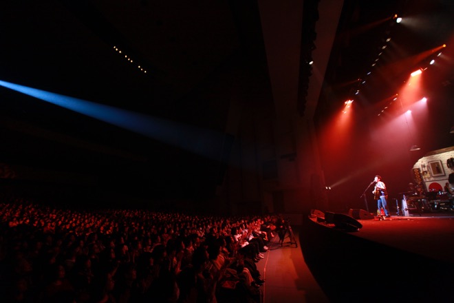 今まで数々のコンサートを経験してきた彼だが、一人でステージに立つのも、人前で1曲以上の弾き語りを披露するのも今回が初めて。11月27日、11月28日、場所は昭和女子大人見記念講堂。観客の前で深くおじきをすると湧き上がる拍手。各日2,000人、計4,000人を動員した本公演は、まさに<はっぴょう会>という名がピタリとハマるアットホームな雰囲気の中、幕は上がった。