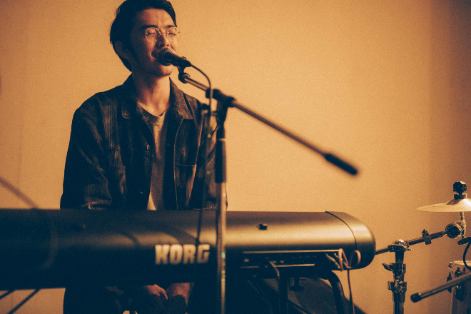 会場に到着すると、入口にはアートワークを担当する野元喬文(Dr)によるメンバーのイラストなどが描かれ、フロアにはこれまでの作品のジャケットが飾られたりと、ハンドメイドな温かみのある雰囲気。開演時刻を過ぎ、オープニング映像に続いて、メンバーが登場し、一曲目に早速「ミルクチョコ」が披露された。音源ではアコギが印象的だったが、この日は荒谷翔大(Vo)のエレピ、斉藤雄哉(G)の艶やかなギターと、田中慧(B)と野元によるゆったりとしたリズムに乗って、ファルセットを織り交ぜながらソウルフルな歌を紡いで行く。