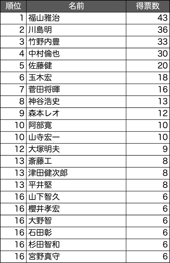 男性は昨年に続いて福山雅治が総合1位を獲得。好きな理由として「低くてセクシー」「落ち着く」などのほか、「本能があの声を求める」という回答もあった。2位は麒麟・川島明、3位は 竹野内豊という結果で、両名とも好きな理由として「低音が好き」「渋い」という理由が多く、全体的に低くて渋い声の人気が高い結果となった。