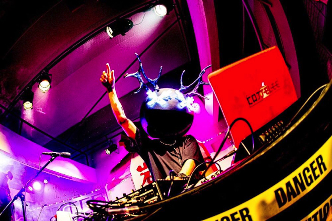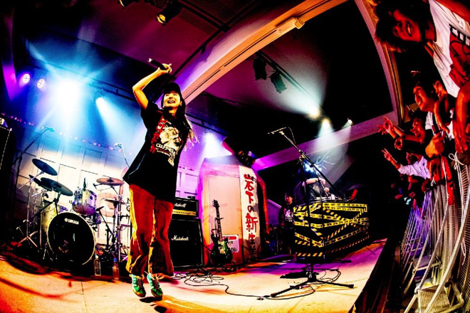 開演時刻になり、ピンクのイメージカラーが印象的な「岩下の新生姜ミュージアム」の一画で巨大なスピーカーや鉄柵が設けられたさながらライブハウスのステージエリアにメンバーが登場すると、会場は一気にヒートアップ。「おそなってごめん!ただいまー!」と叫ぶセキはん(キャーキャーうるさい方と女声)に本拠地でのライブを待ちわびていた地元ファンは1曲目「ぶっ生き返す!!」から一糸乱れぬヘドバンで応戦!続く「包丁・ハサミ・カッター・ナイフ・ドス・キリ」ではDANGER×DEER(DJ / KSUKE)による2号店ならではの楽曲味付けとわかざえもん(4弦)のグルーヴが会場を盛り上げる。