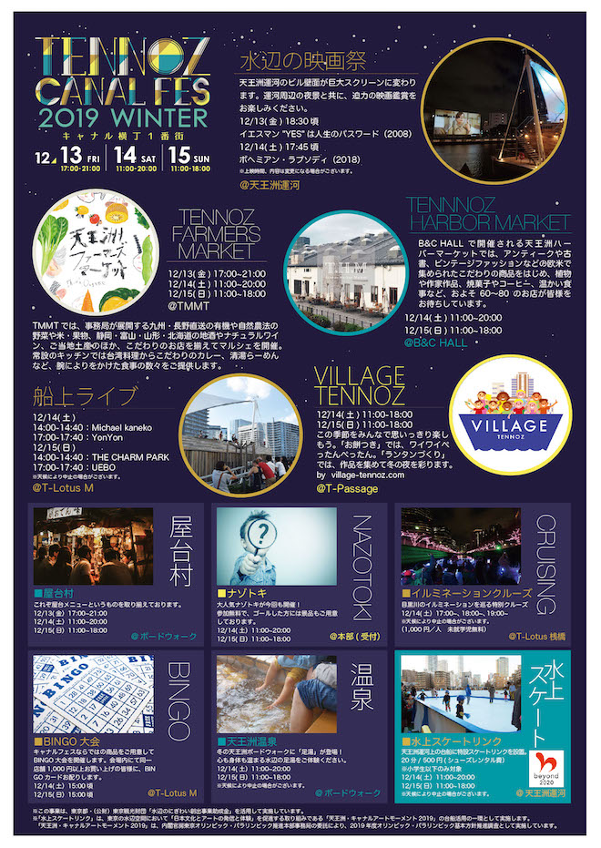 <天王洲キャナルフェス2019冬 ~キャナル横丁1番街~>では、運河沿いのビル壁面に映像投影する「水辺の映画祭」や各地の名産や逸品に出会うマーケット「TENNOZ FARMERS MARKET」、アンティークや作家作品など生活を彩る逸品と出会える「TENNOZ HARBOR MARKET」、参加型の「謎解きゲーム」、水辺空間を包む多彩な音楽を楽しめる「船上ライブ」、イルミネーションされた目黒川を巡る「ナイトクルーズ」、豪華景品のあたる「ビンゴ大会」などが行われる。