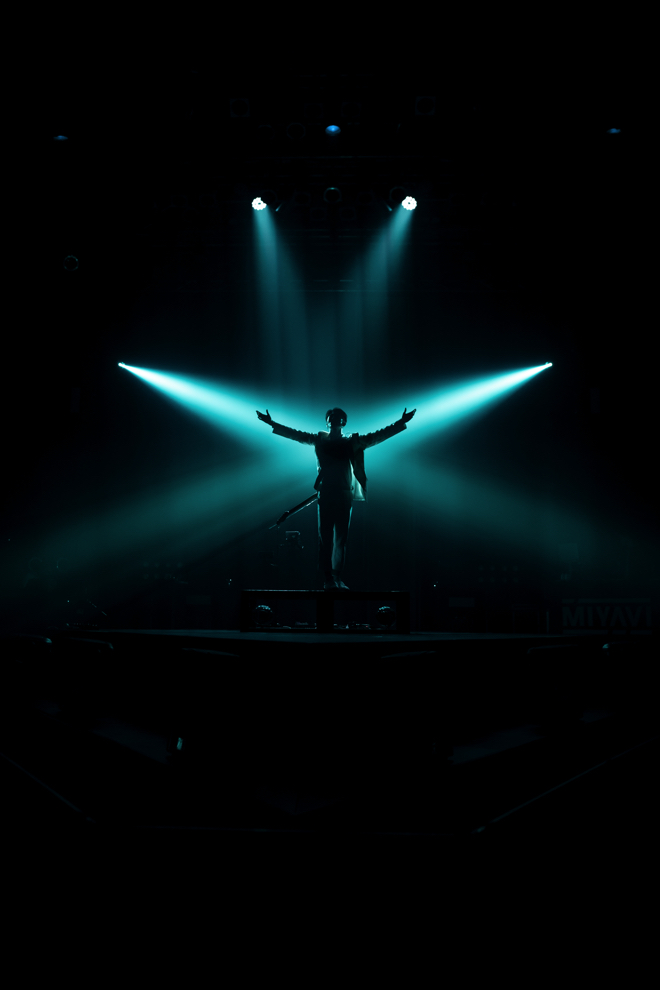 寒い天候に見舞われた札幌初日公演は、本人が登場する前から場内は熱気に包まれていた。背景の縦型映像と照らし合わせてのレーザー光線の演出による「Stars」でMIYAVIが登場すると、一気に場内はヒートアップ。MIYAVIの解き放つ音色に合わせながら、色鮮やかなレーザー光線を多用し、近未来の背景と重なり、MIYAVIの世界観をさらに進化させたライブとなり、会場全体を盛り上げる形となった。その後、「Flashback」「In Crowd」「Bumps In The Night」とテンポの良い曲を披露し、冒頭から会場を大いに沸かせた。その後、7月に三浦大知とKREVAとともにテレビ朝日系列『MUSIC STATION』で披露した「Rain Dance」をソロでパフォーマンス。持ち前のギターのソロをしっかりと場内に響き渡らせた。