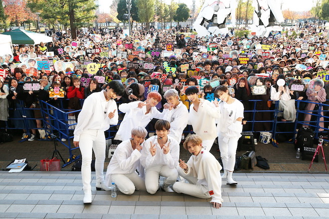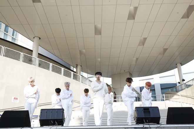 今月4日にはナゴヤドームで行われたアジア最大の音楽授賞式「2019Mnet Asian Music Awards」でも受賞を果たし、 勢いに乗る彼ら。 今日のステージでは「UTOPIA(Japanese ver.)」「 AURORA(Japanese ver.)」「WONDERLAND」の3曲を披露。 冬の寒さを吹き飛ばすような熱気あふれるパフォーマンスに、集まった約2000人のファンも大きな歓声で彼らを迎えていた。