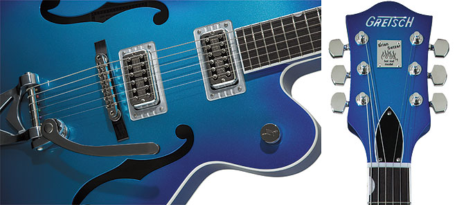グロス・フィニッシュのブラック・ラッカー・カラーが特徴のモデル。こちらも16インチ幅のナッシュビル・スタイルのシングル・カッタウェイ・ホロー・ボディに24.6インチ・スケールを採用。メイプル材のアーチド・トップ・ボディ、2.75インチのボディ厚と1959年スタイルのトレッスル・ブレイシング、ヴィンテージVシェイプのネックグリップにコンパウンド・ラジアス採用のエボニー指板、アジャストマティック・ブリッジを組み合わせたピンド・ローズウッド・ベース、グレッチ・オリジナルのゴトー製のロッキング・チューナー、デルリン素材ナットの採用による安定したチューニングも同様だ。