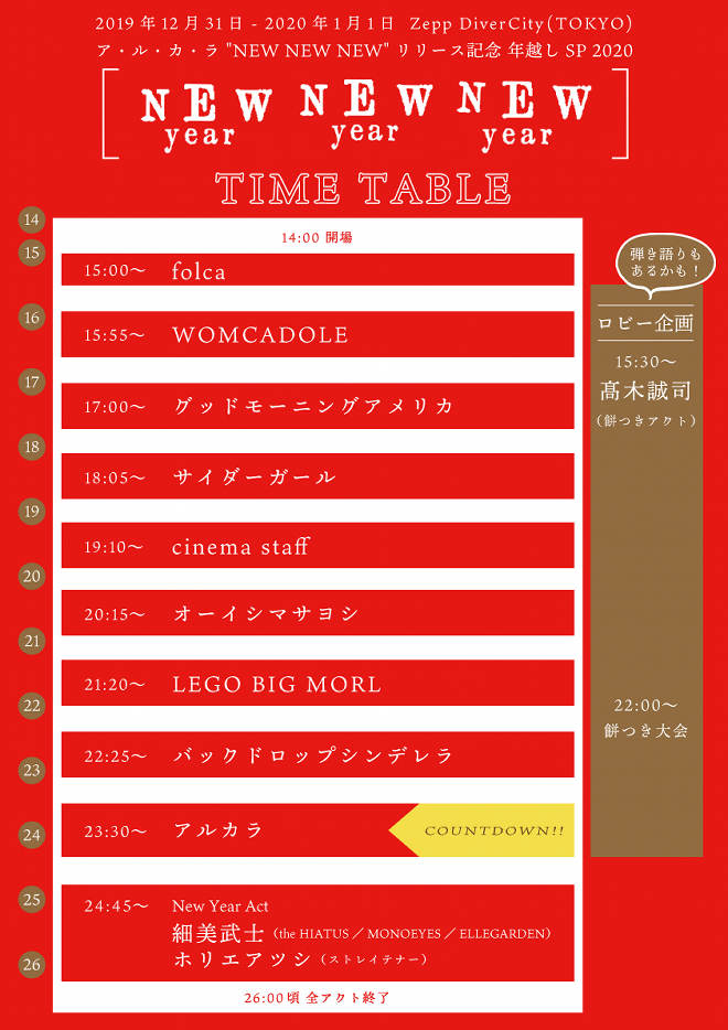 今回発表されたふたりはNew Year Actとして出演する。イベントの出演者はアルカラを含めて全12組となり、同時にタイムテーブルが公開された。カウントダウンはイベントホストのアルカラが務める。