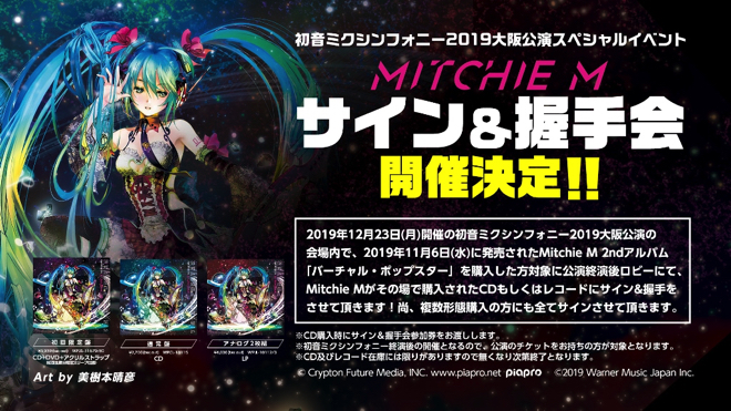 『初音ミクシンフォニー~Miku Symphony 2019 オーケストラ ライブ CD』は12月18日(水)に発売。その翌週、23日(月)に開催される大阪公演では、“クリスマススペシャル”としてクリスマススタンダード曲や「Snow Song Show」(sasakure.UK×DECO*27)も演奏される予定となっている。会場ではライブCDの購入者を対象とした大抽選会や、Mitchie Mの2ndアルバム『バーチャル・ポップスター』を購入すると参加できるサイン&握手会が実施されることも決定した。