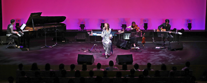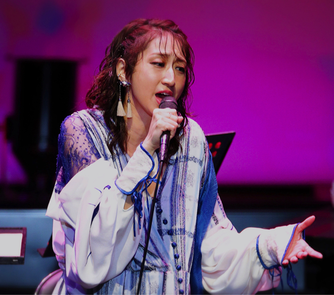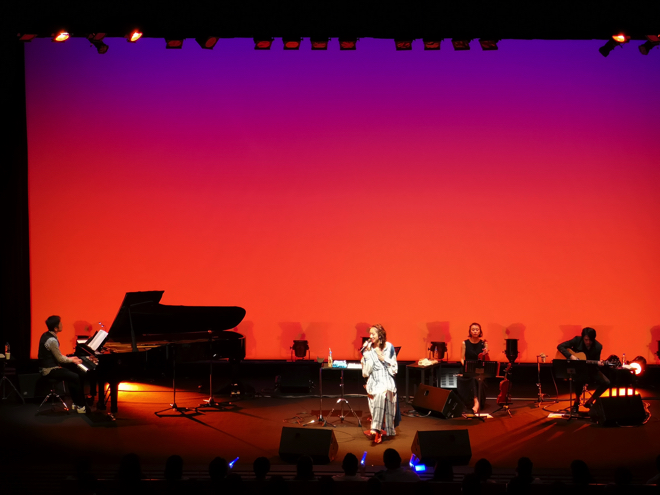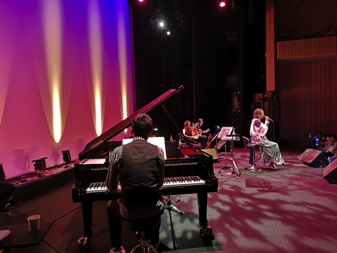 チケットは機材開放席も含めて全てソールドアウト。満員の客席の前に、金沢らしい和を思わせる青のドレスとハイヒールで登場したMs.OOJAは、ニューアルバム『SHINE』から吹き抜ける潮風のように爽やかなナンバー「海を見てる」を伸びやかに歌い上げる。