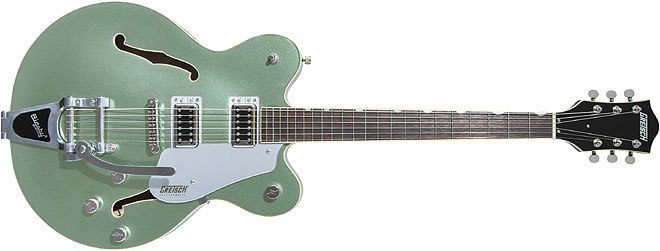 チェンバード加工したスプルース材のセンターブロック、パーロイド・ネオクラシック・サムネイル・ポジション・インレイを施したローレル指板、メイプル・ネック、セットネック・ジョイント、ブラックトップ・ブロードトロン・ピックアップ、ダイレクト・マウントのアジャストマティック・ブリッジといったスペックは「G5622T Electromatic Center Block Double-Cut with Bigsby」と同様。マシンヘッドやGアロー・コントロール・ノブなどのハードウェアはニッケルで統一。ビグスビーは搭載せず、グレッチ・オリジナルのVストップ・テイルピースを搭載している。