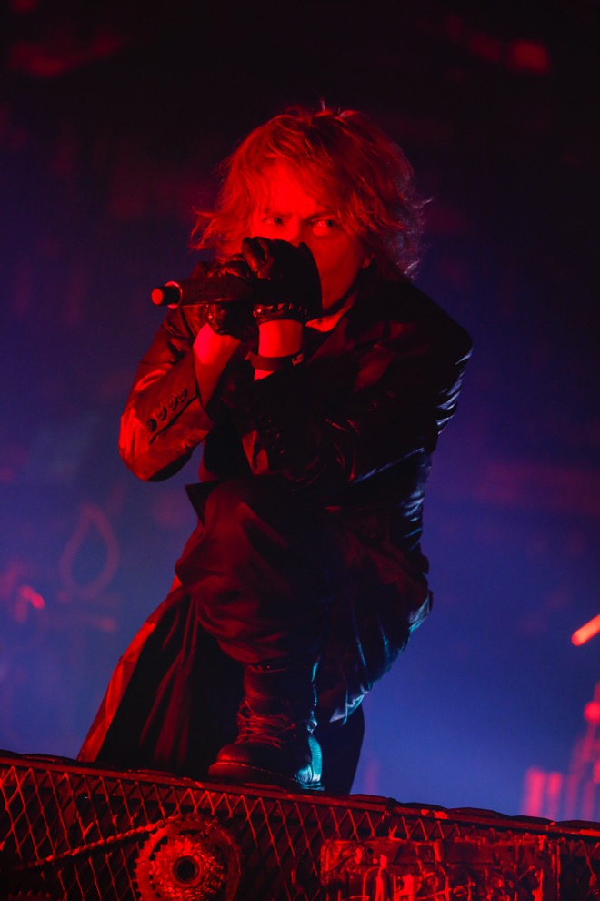 暗転した会場に鳴り響く美麗な鍵盤は「ZIPANG」の序奏。ときおり時空が歪んだかのようなエフェクティヴなサウンドが挿入されて、それまでの喧噪とは異なる静かな空間が築かれる。ピンスポット下で熱唱するHYDEの感情の昂ぶりをなぞるようにバンドサウンドがサビで爆発。陰りと熱情を帯びた同曲は、歌詞やメロディーに日本らしさが息づくミディアムチューンという意味でも、HYDEのヴォーカルがどこまでもストレスなく伸びていくという意味でも、あまりにも美しかった。ギタリストが弾くストロークに同調して客席が声を上げるコール&レスポンスをイントロに、「OUT」へ。深く赤いライトがスモークを妖しく照らす演出は、切れ味と重さが同居したユニゾンリフとHYDEのヴォーカルに凄味をもたらした。そして、MCではアルバム『ANTI』について語られた。